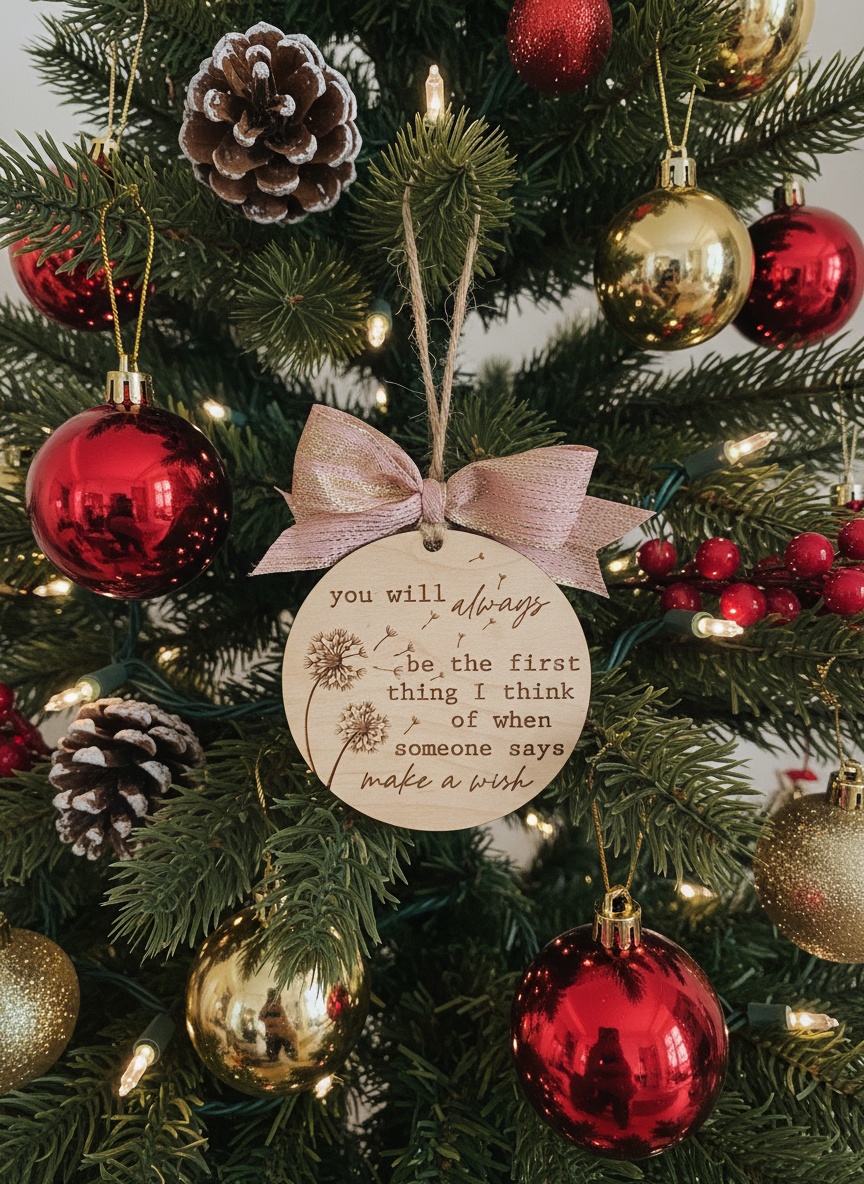 Een prachtig houten kerstornament met een ontroerende boodschap. Dit ornament is ideaal als blijvende herinnering aan een dierbare en voegt een persoonlijke, warme touch toe aan je kerstboom.